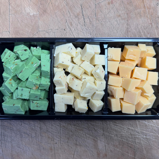 een Kaas Trio van: groene pestokaas, Land van Cuijk kaas en Tomaat-olijf kaas