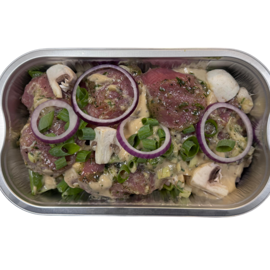 varkenshaas french garden champignon saus groente mix: champignon, rode ui, prei, bosui, paksoi en sugar snaps